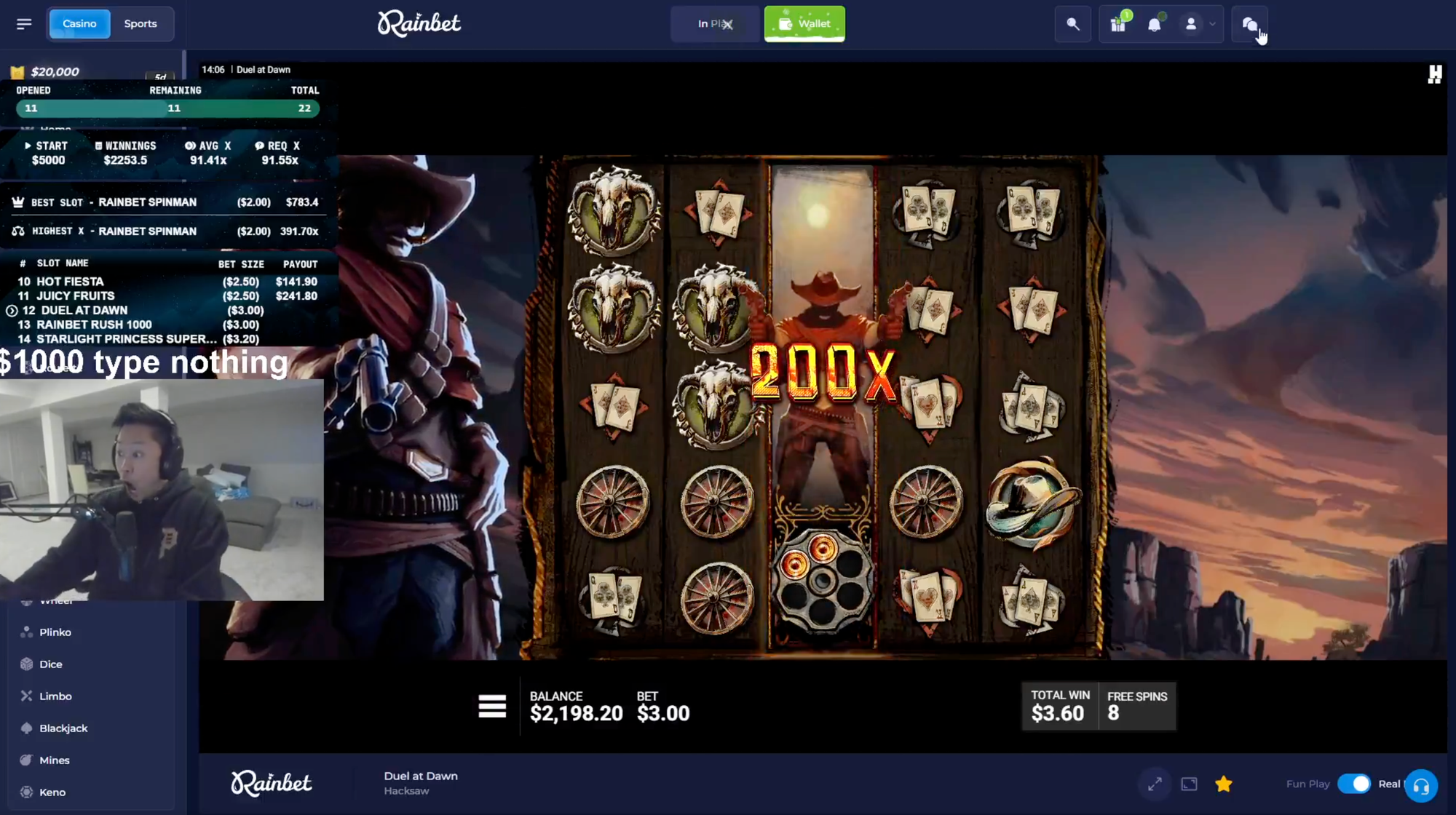 snutzy tries to remain calm after hitting a 2000x on Hacksaw's Duel at Dawn.
