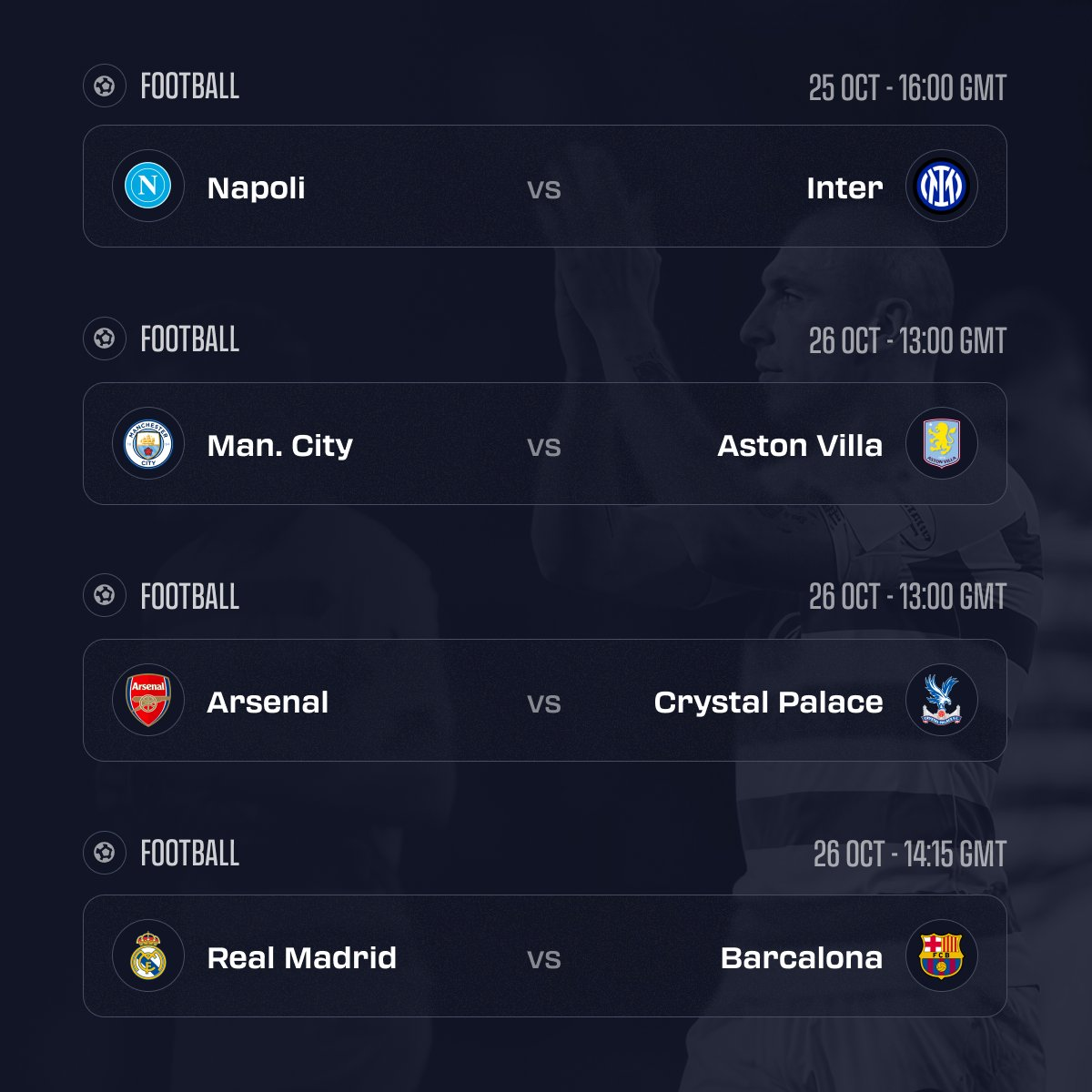 - Another important title-race matchup as Napoli look to beat Inter, both teams currently sit 2nd and 3rd on 15 points, so the stakes are high.